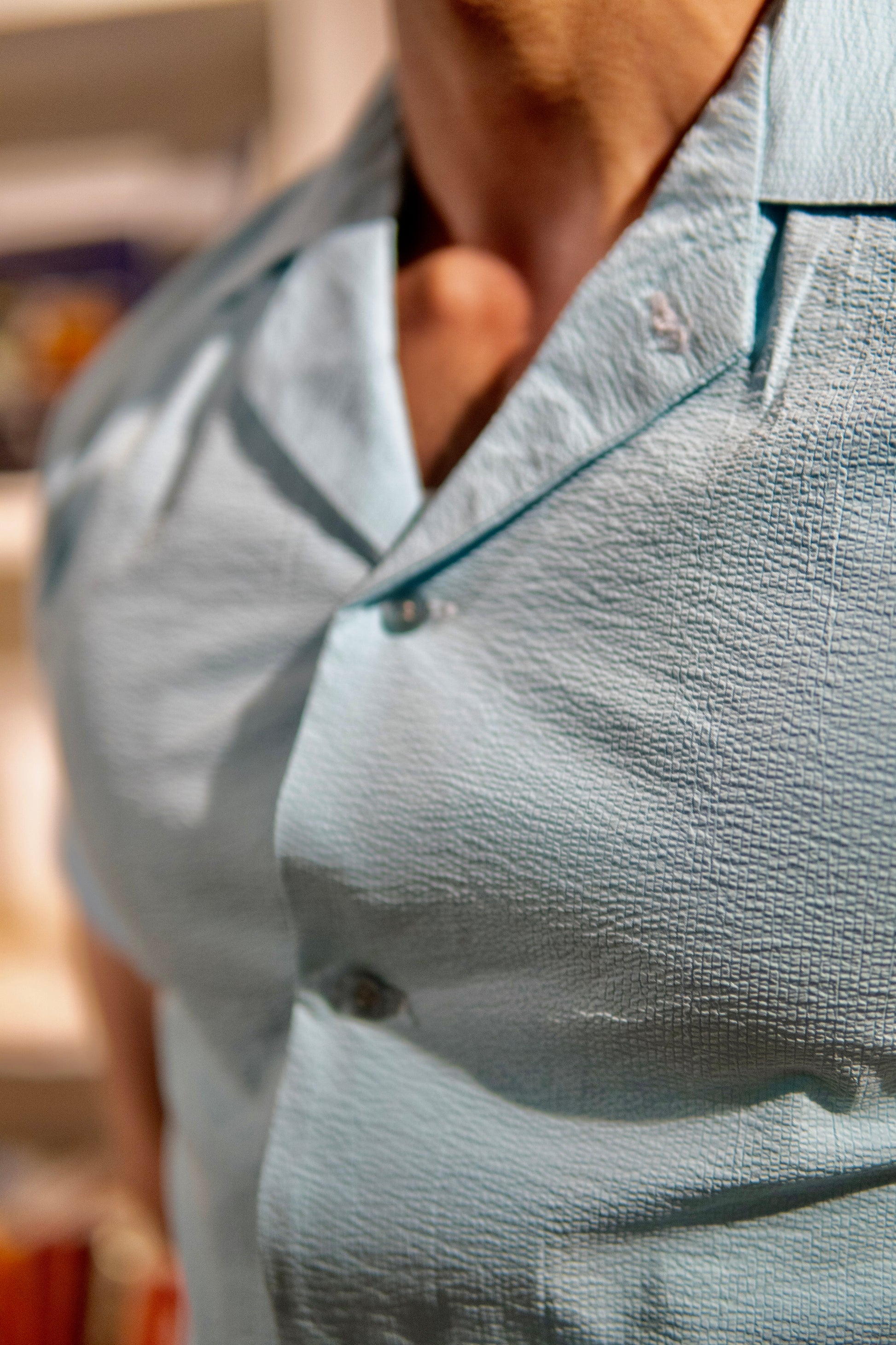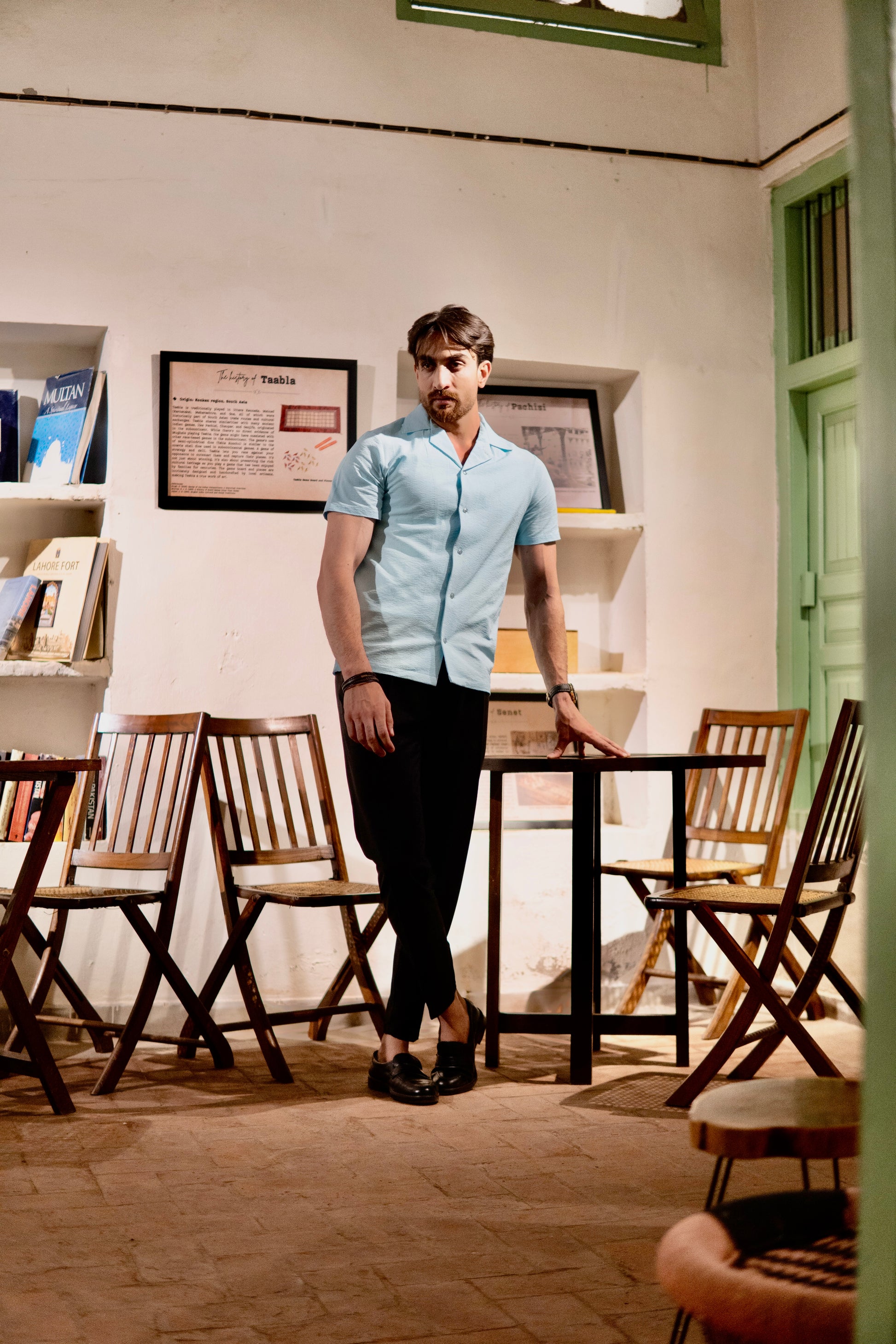 Blue Signature Knitted Cuban shirt for men by Vestige Apparels made from 100% polyester stretchable fabric. Features a soft knitted texture, open Cuban collar, button-down front, and short sleeves. Relaxed fit design with high-quality finishing, perfect for summer comfort and everyday casual wear.