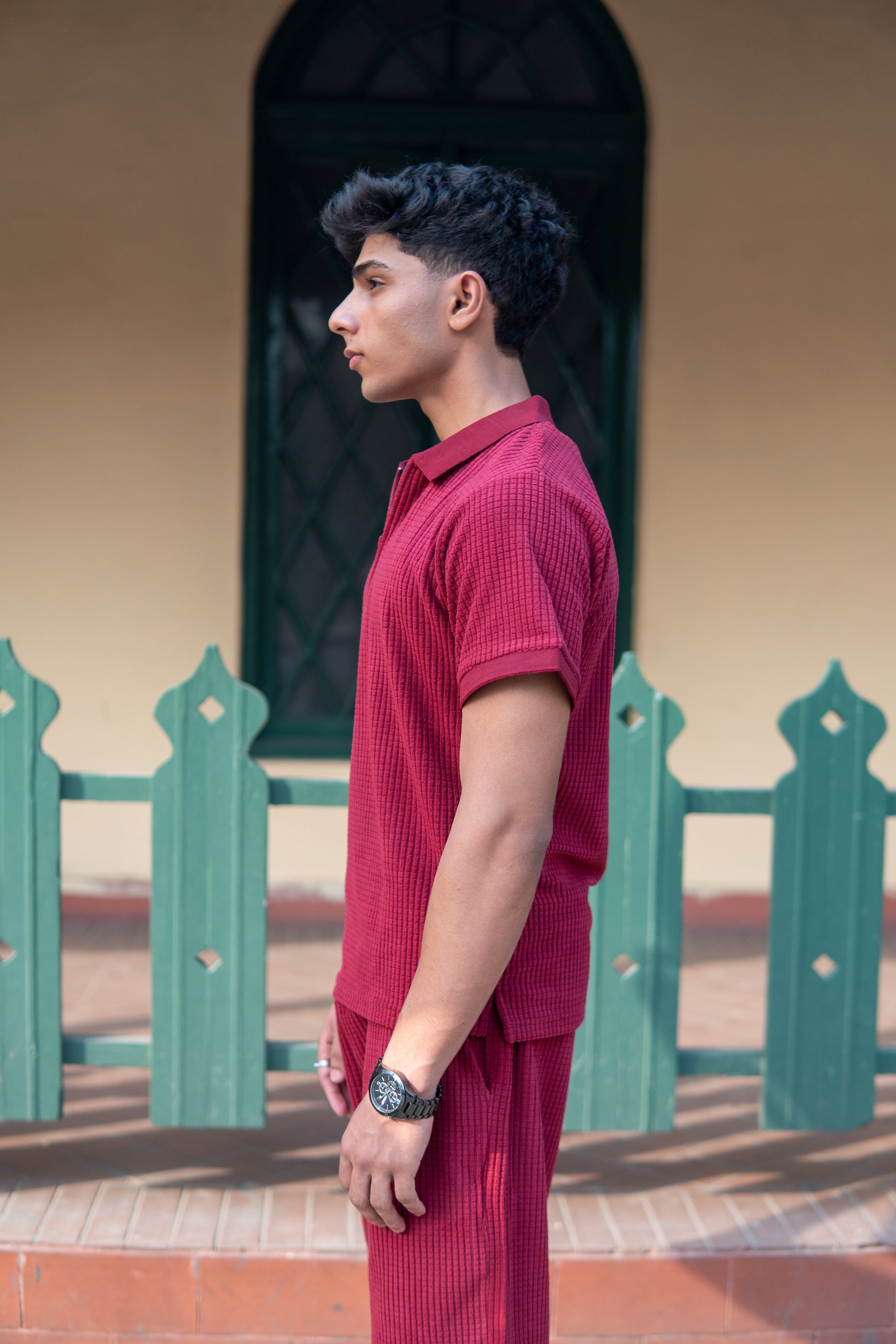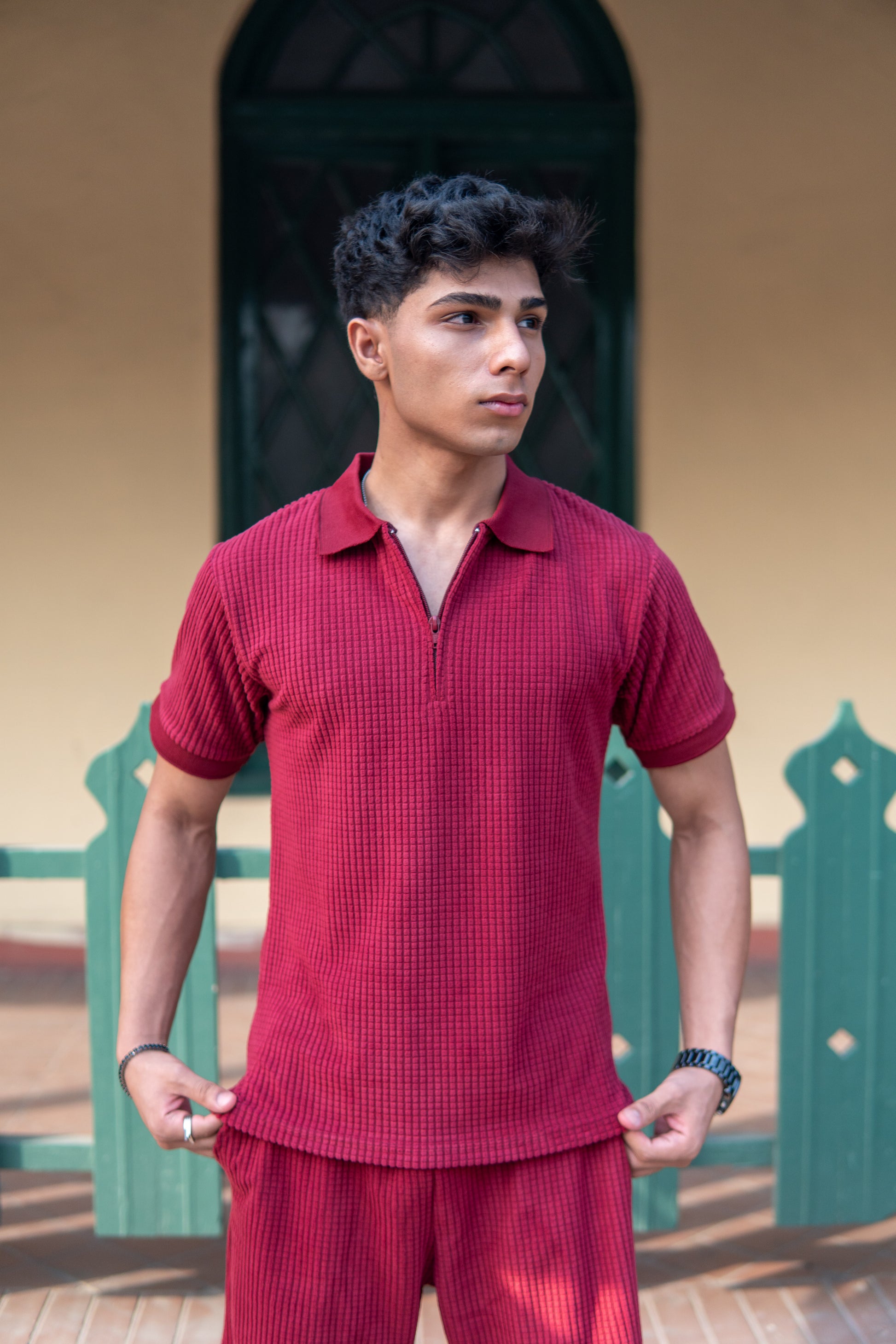 This wine square knitted polo shirt for men by Vestige Apparels combines style and comfort effortlessly. Crafted from premium cotton, this knitted polo shirt features a unique square knit texture that adds depth and sophistication to the fabric. The soft and breathable cotton polo shirt ensures all-day comfort, making it ideal for men’s summer wear and casual occasions. It is designed with a modern metal zipper on the placket, this zipper polo shirt replaces traditional buttons for a sleek, trendy look. The stylish polo collar maintains a smart casual vibe, perfect for both casual men’s shirt lovers and those seeking a designer polo shirt for semi-formal settings. The half sleeves and regular fit provide a comfortable and flattering silhouette.